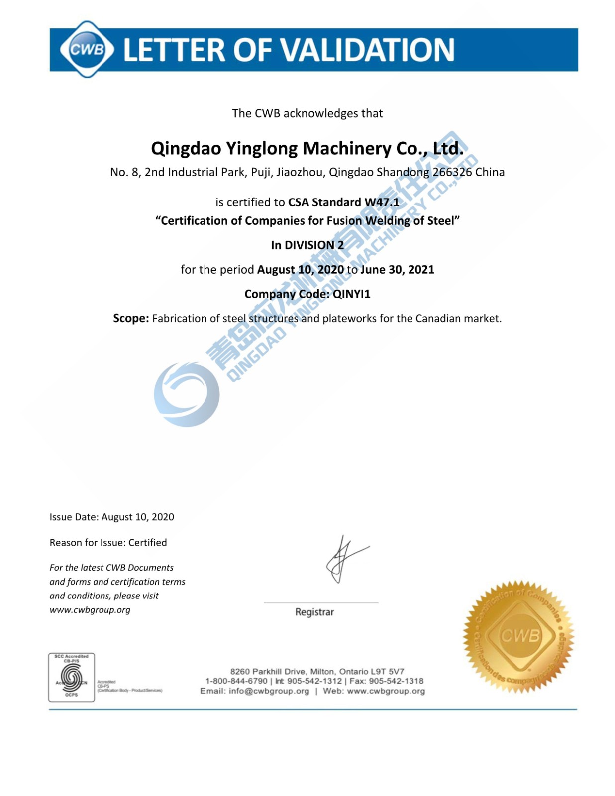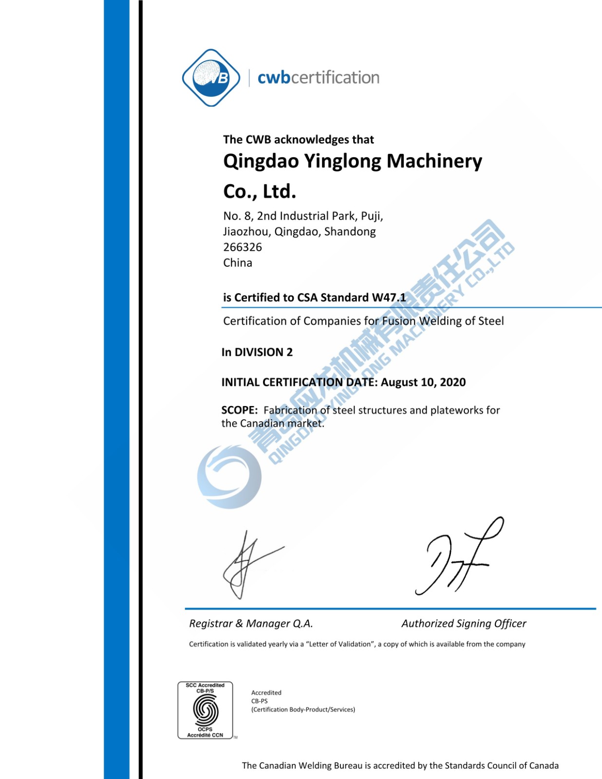 2020年8月11日,青島應(yīng)龍收到加拿大焊接局發(fā)來的CWB認(rèn)證證書,公司順利通過加拿大CWB認(rèn)證。